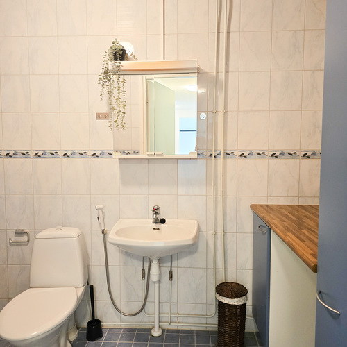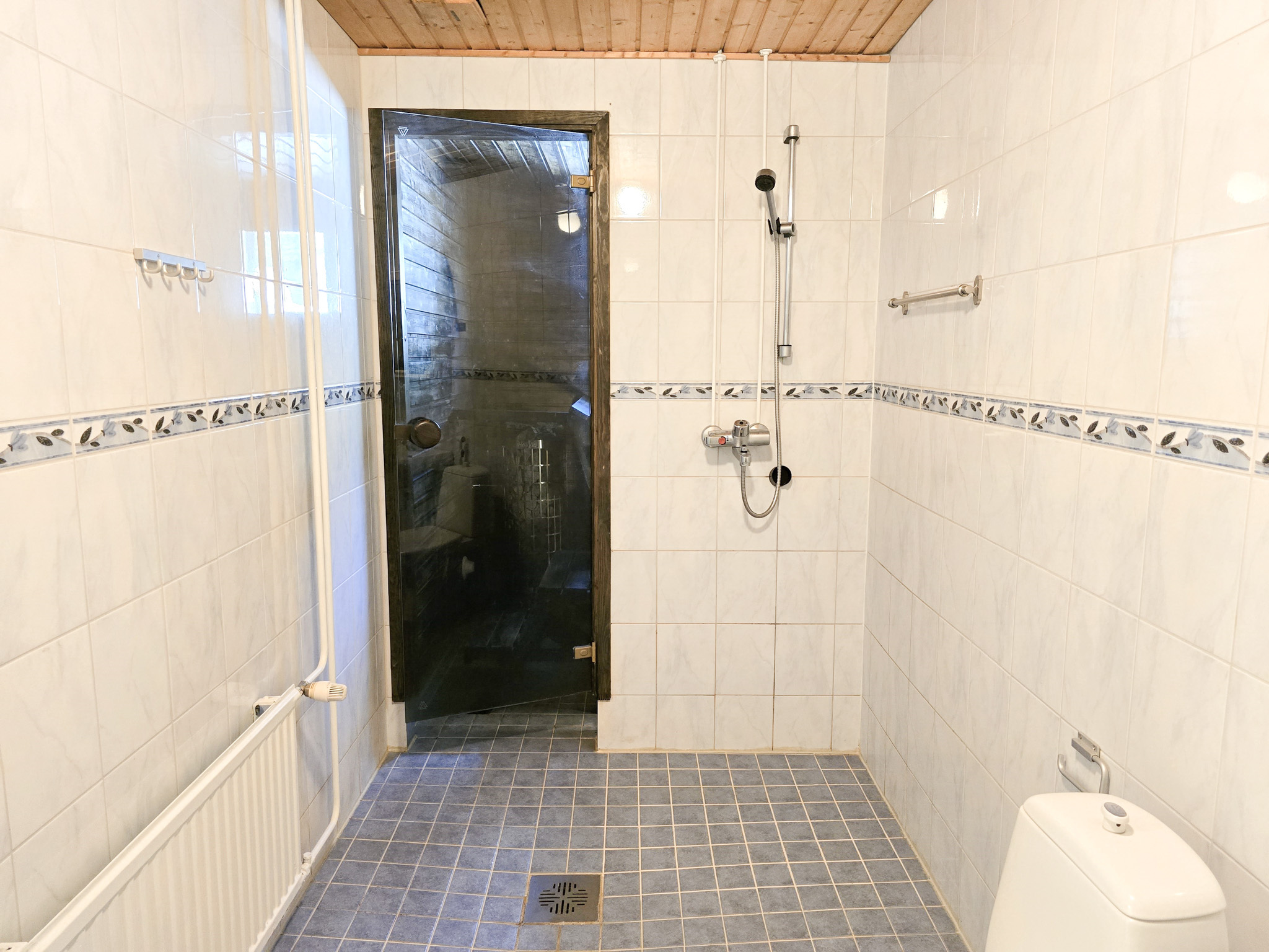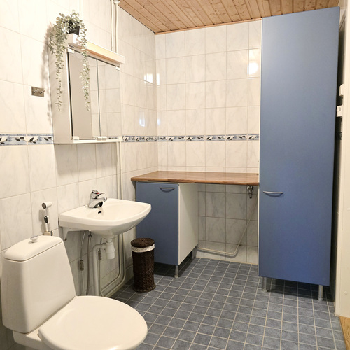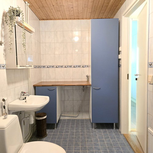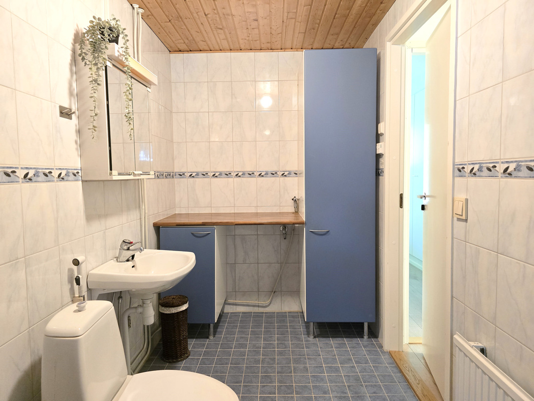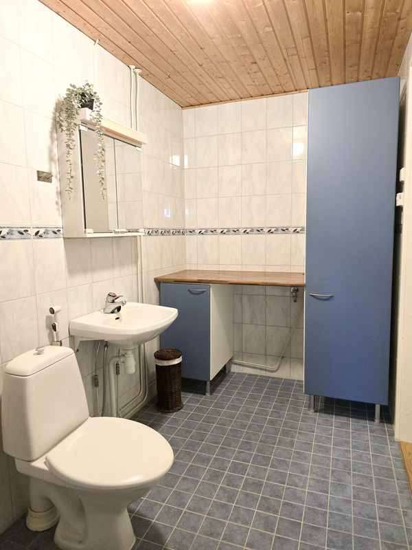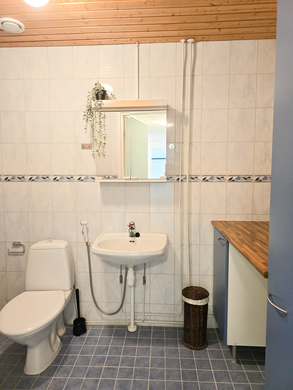 Varusteet: suihku, peilikaappi, kylpyhuonekaapistot, pesukoneliitäntä, lattialämmitys, suihkuseinä
