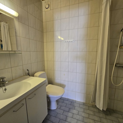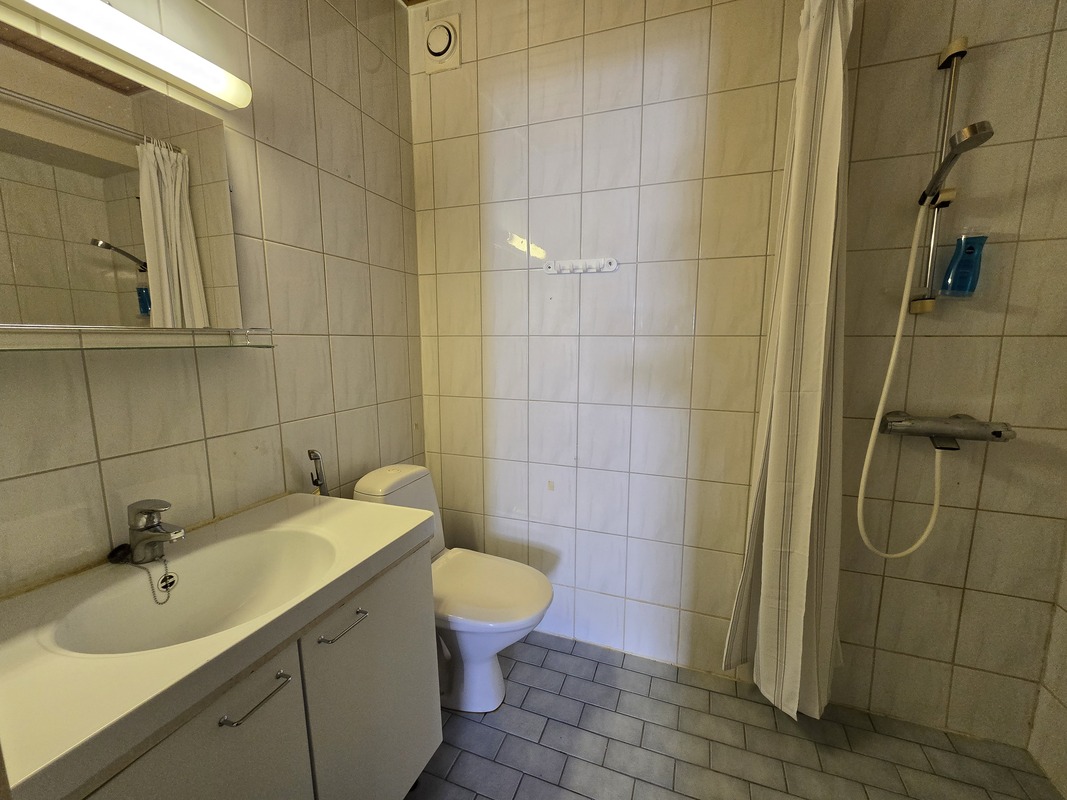 Varusteet: suihku, allaskaappi, peili, pesukoneliitäntä